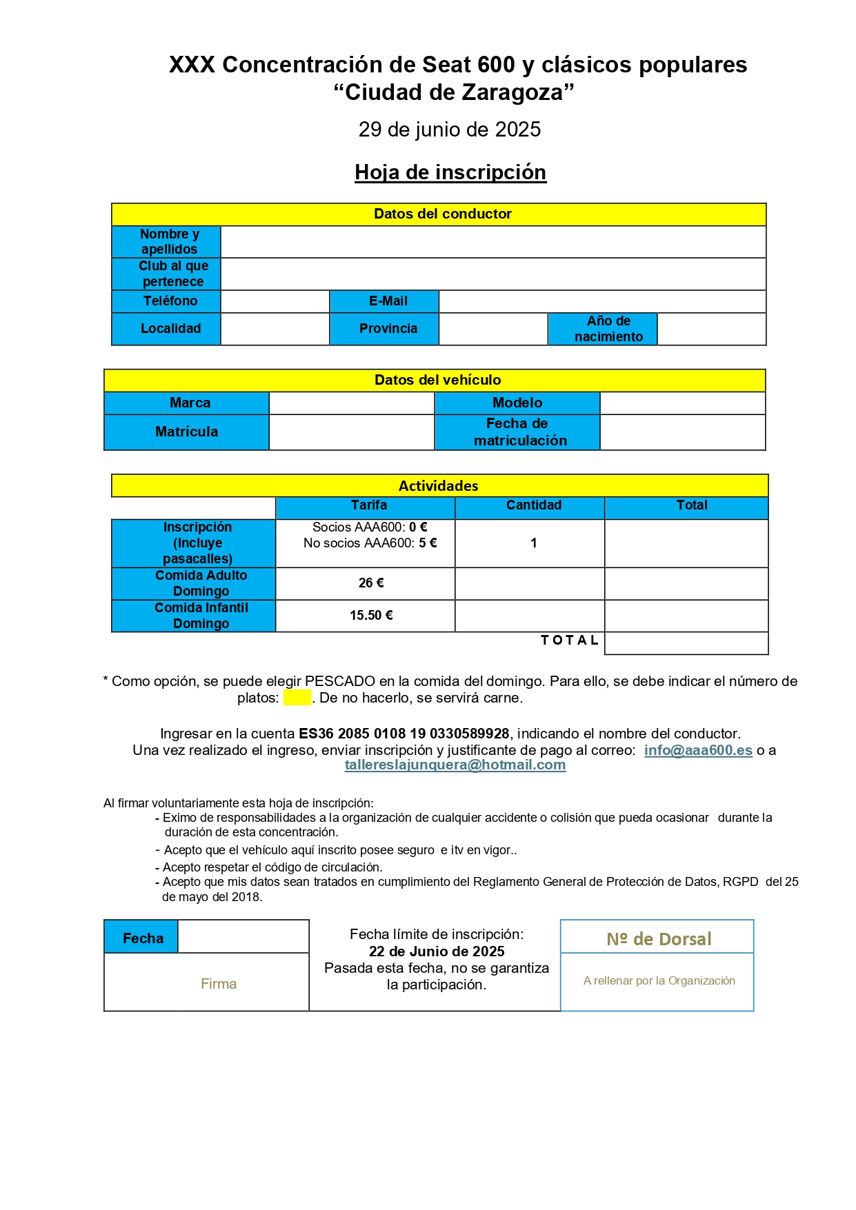 La concentración está abierta a todo tipo de vehículos clásicos de 30 años o más. Por tan sólo 5€ por la inscripción, se obtendrá una bolsa conmemorativa y un almuerzo. Las inscripciones están abiertas hasta el día 22 de junio de 2025, en el caso de que se vaya a acudir a la comida. Si solo se quiere participar en el pasacalles, las inscripciones se mantendrán hasta el mismo día 29 de junio de 2025